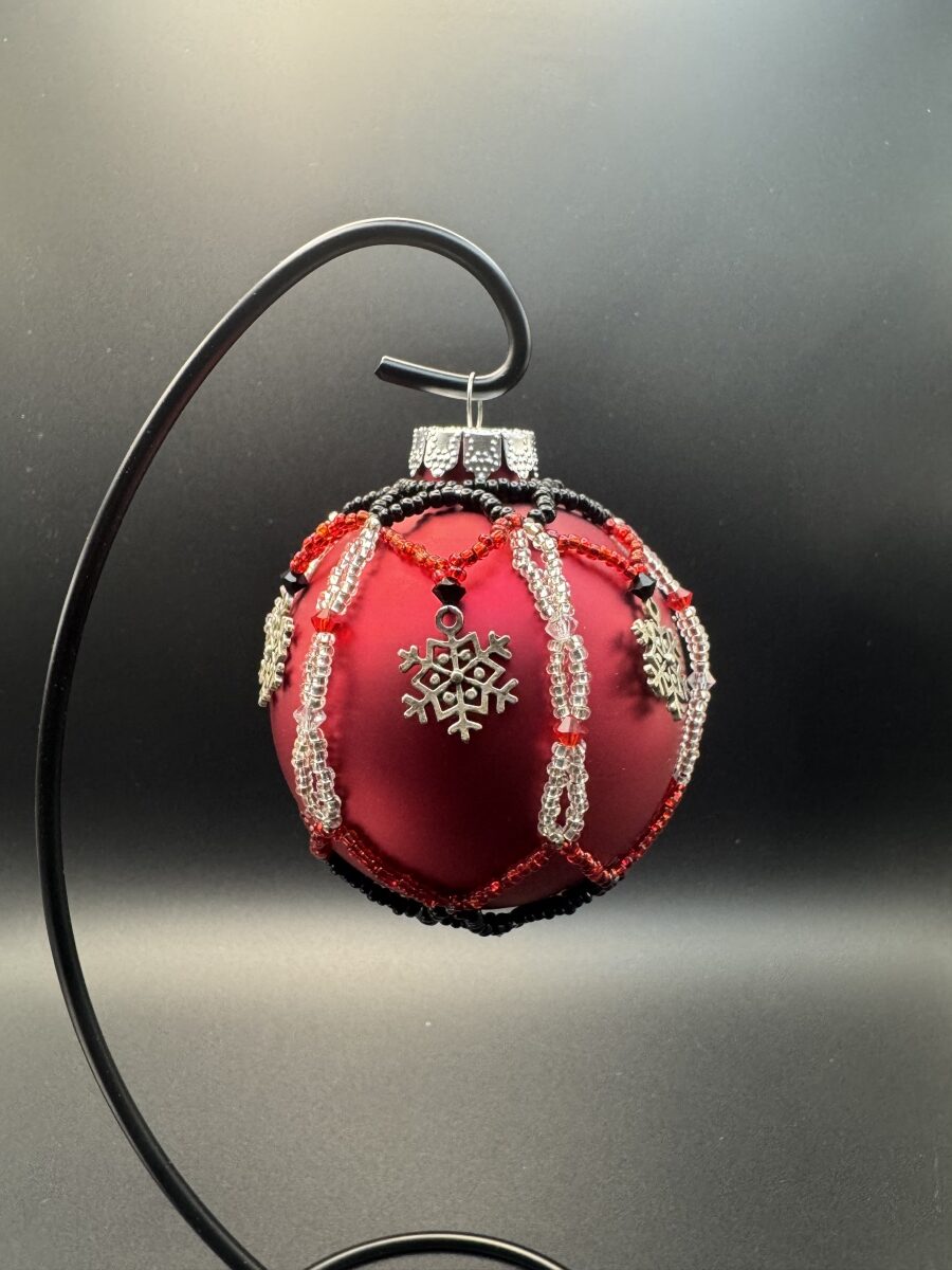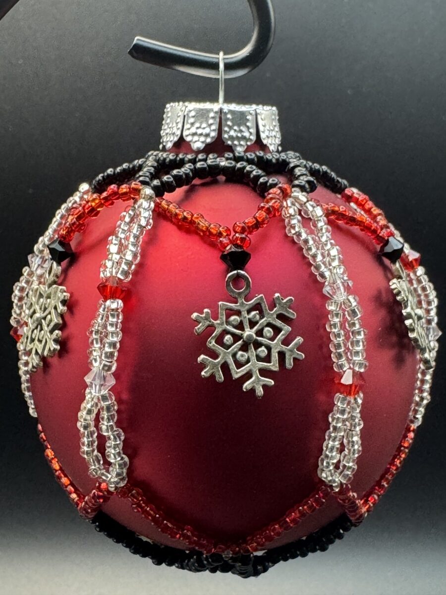 This ornament is made of glass, and its hand-beading is made of glass seed beads and silver-plated snowflake charms.