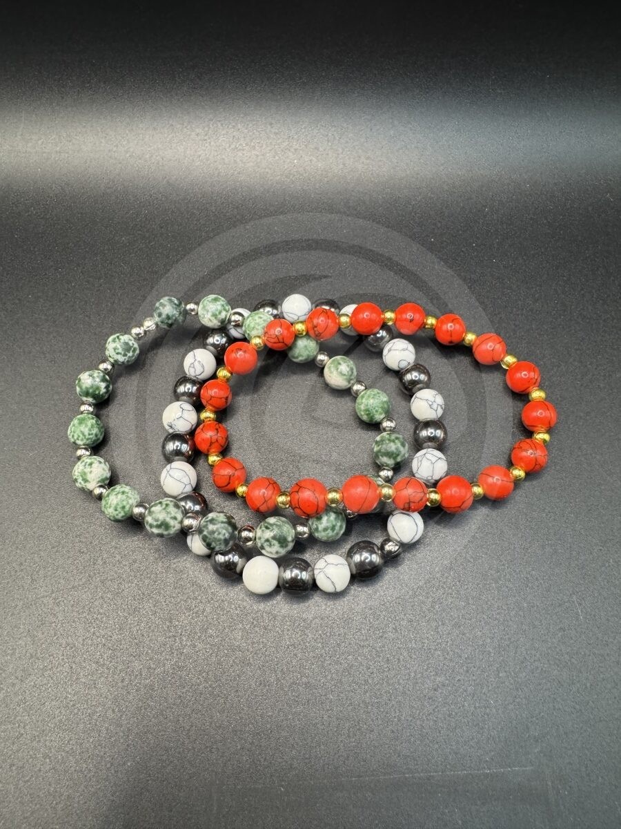 Wear this bracelet trio during the holidays and crank up your jolly! In red, white, and green, the iconic Yule/Christmas colors and gemstones were chosen to represent the spirit of the season: helping you build memories, grant you patience, and encourage your creative side.