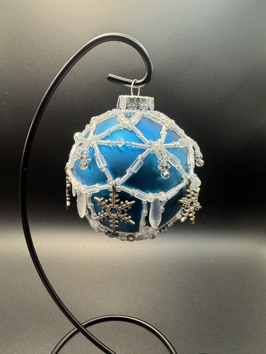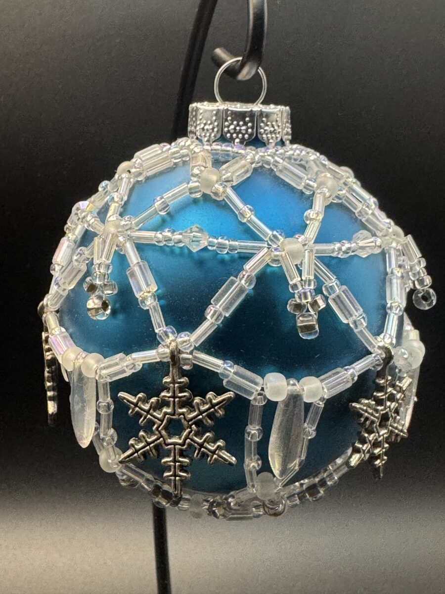 This ornament is made of glass, and its hand-beading is made of glass seed beads, and silver-plated snowflake charms.