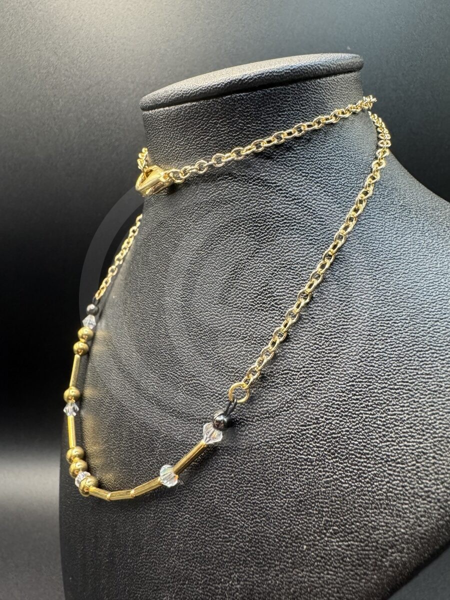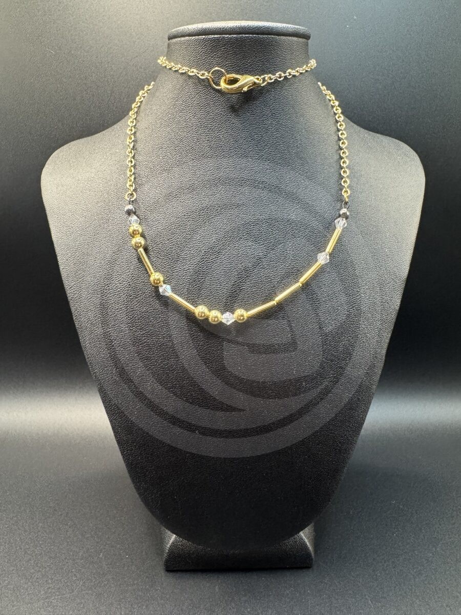 This “FDJT” Morse code necklace is made from gold-plated beads and chain with clear faceted bicone beads.