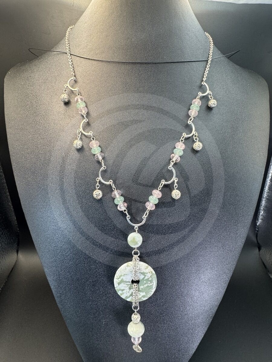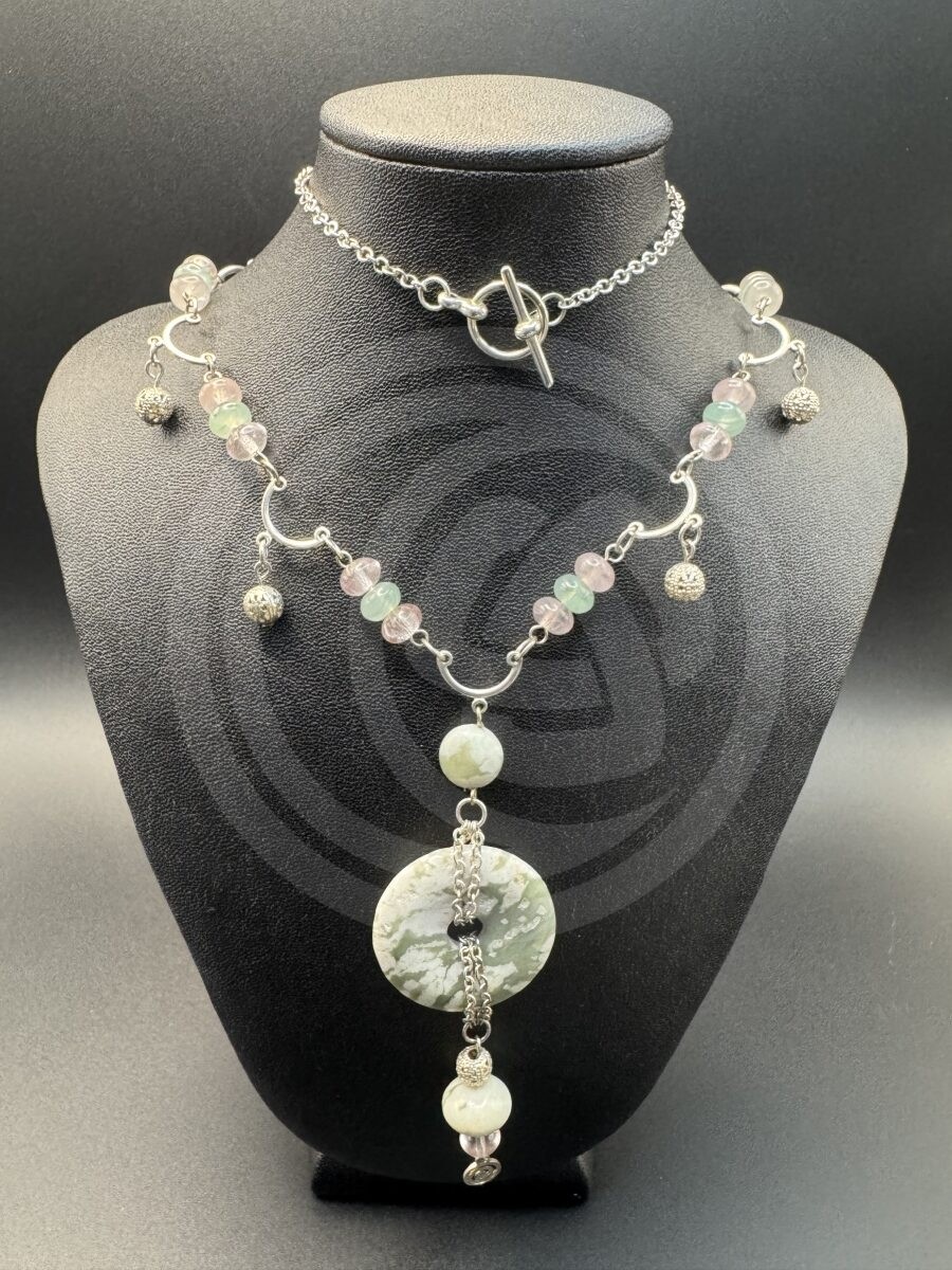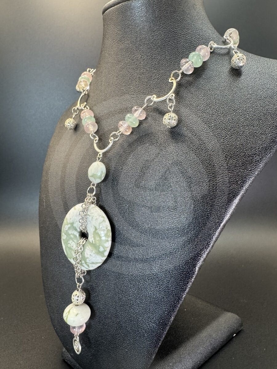 Accented with rose quartz and aventurine beads, the peace jade donut focal is combined with silver-plated beads and findings for a cool, easy feel.