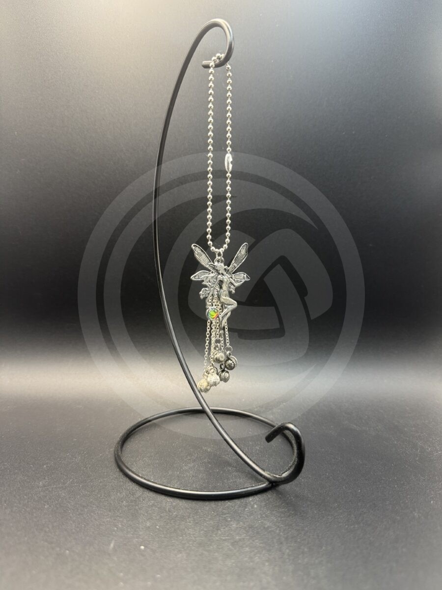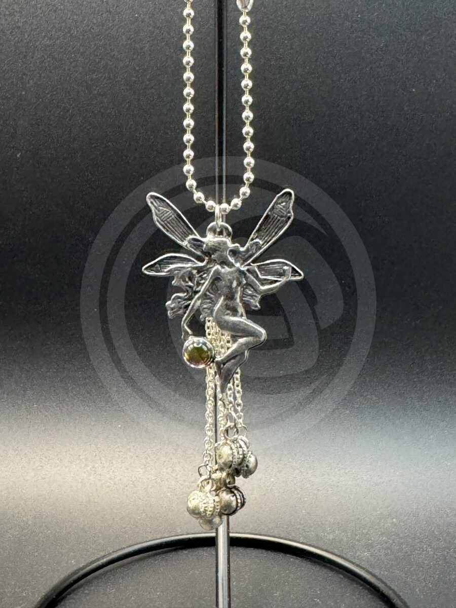 A sexy faerie with long hair and dragonfly wings poses midair with a tiny iridescent glass orb.