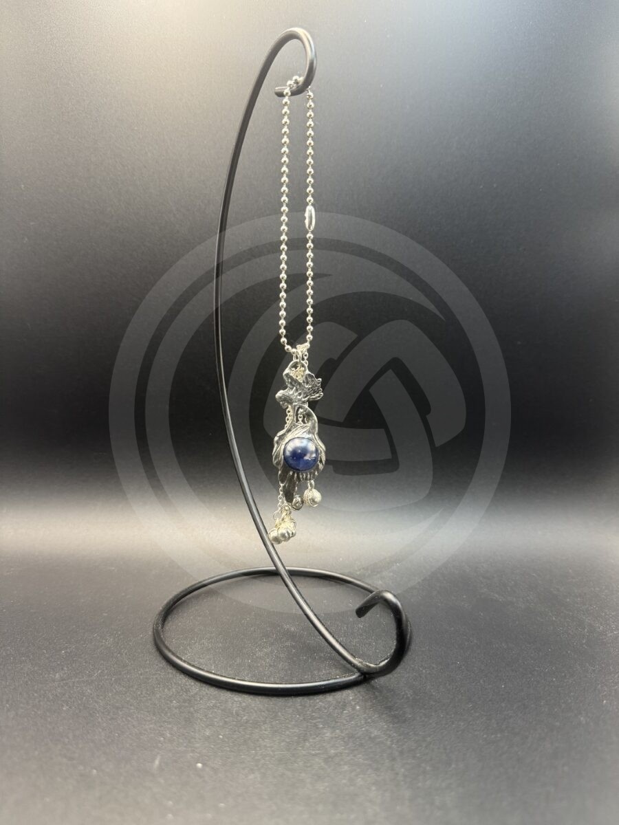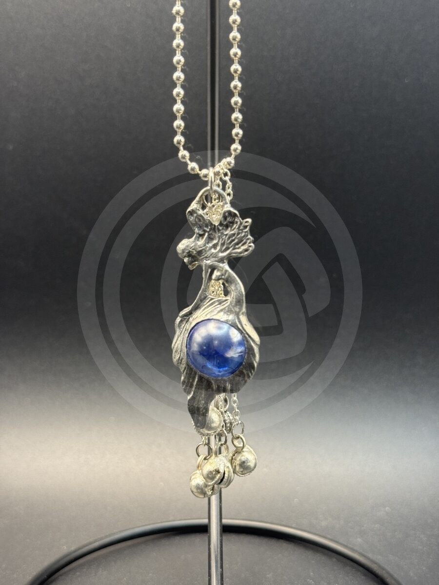 A fairy with butterfly wings slouches while sitting on a cobalt glass orb with an iridescent sheen. Her flowing dress holds the orb in place.